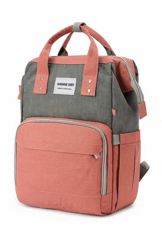 2-in-1 Diaper Bag & Portable Baby Bed – 7pc Travel Backpack (Peach/Grey)